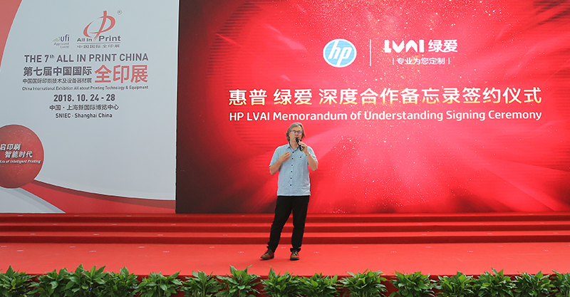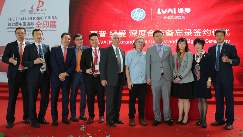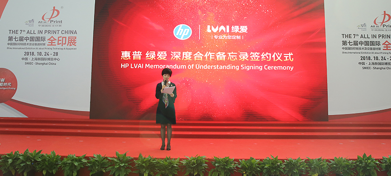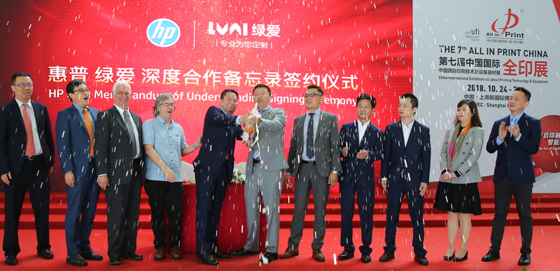 簽約儀式在上海新國際博覽中心2018中國國際全印展現場(chǎng)舉行,綠愛(ài)股份董事長(cháng)郭建波先生、技術(shù)學(xué)院顧問(wèn)Simon Wang;綠愛(ài)股份董事,運營(yíng)總監王學(xué)龍先生;綠愛(ài)股份董事,新業(yè)務(wù)總監孫士鑫先生;綠愛(ài)股份監事,市場(chǎng)總監方桂林先生?;萜展綢ndigo數字印刷業(yè)務(wù)部副總裁兼總經(jīng)理Alon Bar-Shany先生、惠普Indigo數字印刷事業(yè)部中國區總經(jīng)理李鵬先生出席現場(chǎng)。